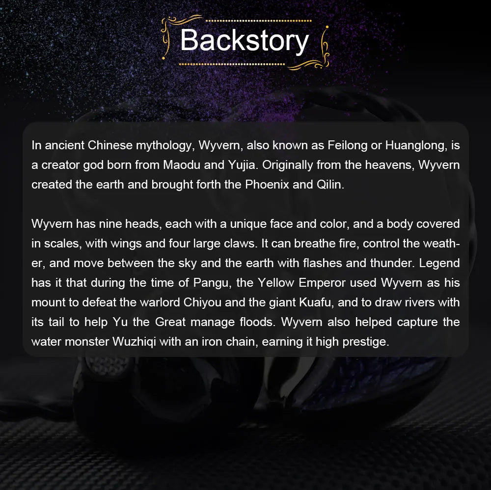 In ancient Chinese mythology, Wyvern, also known as Feilong or Huanglong, is a creator god, originating from the Heavens. Wyern created the earth and brought forth the Phoenix and Qilin. It has nine heads, each with a unique face and color, and a body covered in scales. Wyvern is a god dragon with wings and four large claws, it can breathe fire and controls the weather as well. Celest has taken inspiration from this godly mythological character to design the mighty new Wyvern Black.
