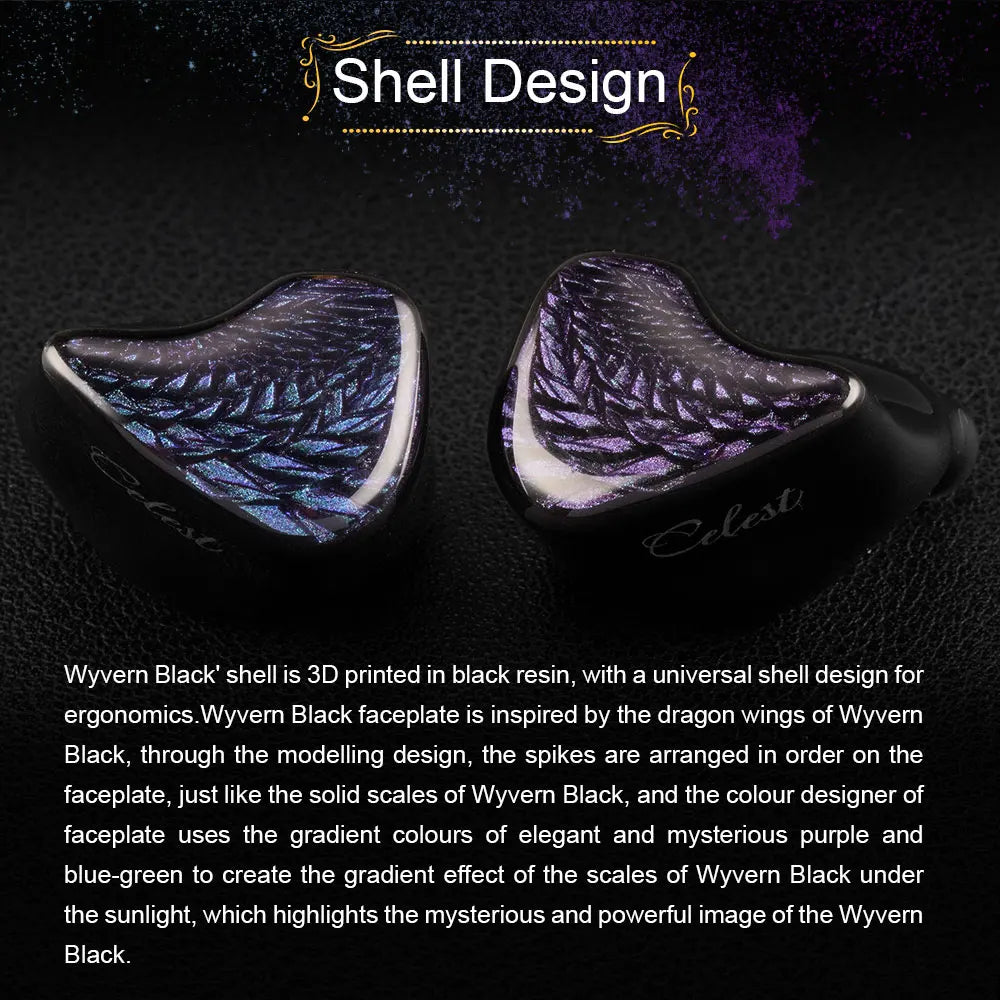 Celest Wyvern Black has solid looks with 3D-printed medical-grade resin ear shells. The shells have beautiful face covers depicting the design of Dragon Wing scales inspired by the wings of Wyvern Black. Just like the solid scales of Wyvern, the colour designer of the pair has featured gradient colours of elegant and mysterious purple and Blue-green to create a majestic look of the Wyvern Black.