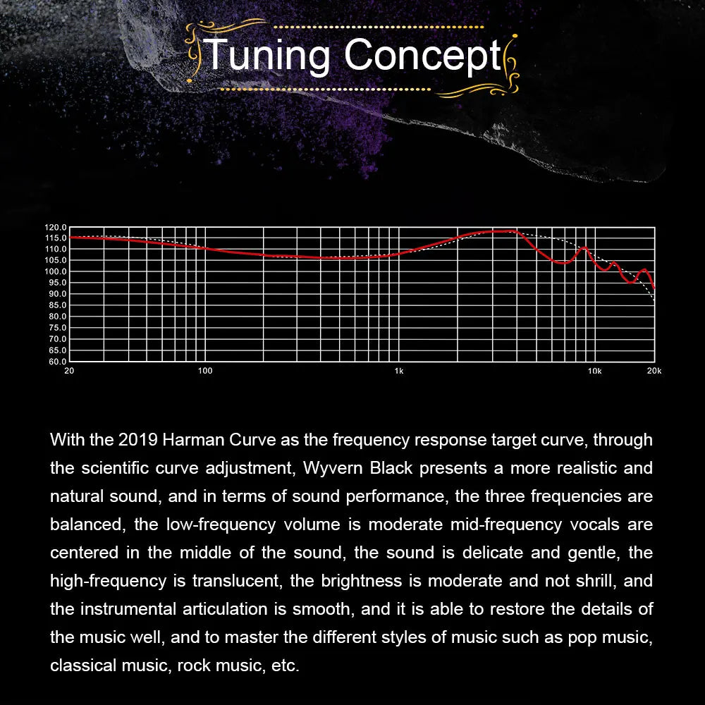 Celest WyvernBlack has been tuned following the 2019 Harman target response curve. The pair packs a realistic and natural sound with a balanced three-frequency response. It delivers a clean and gentle sound with good extensions in the high-frequency regions.