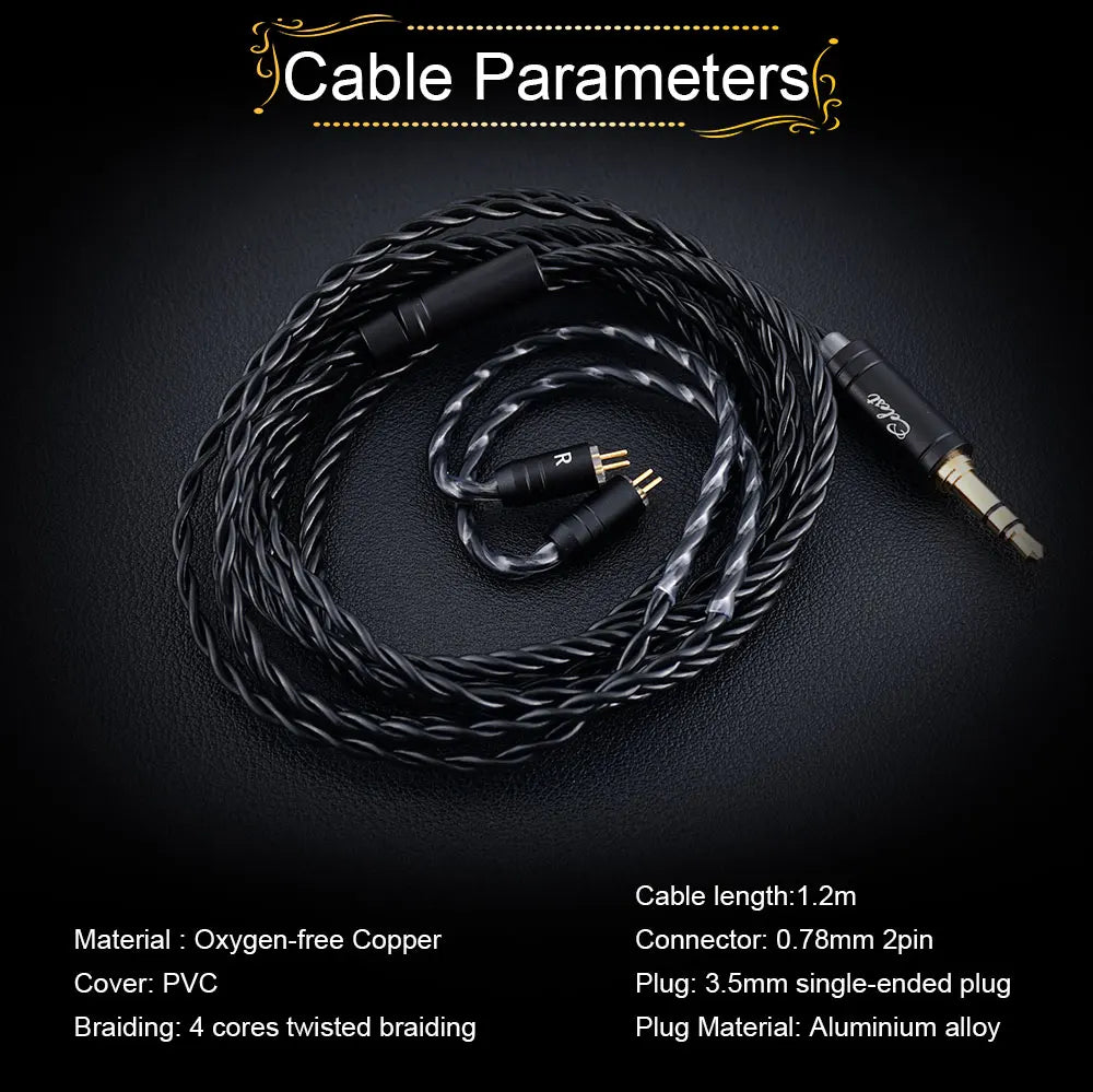 Celest Wyern Black comes with a high-purity stock cable. It is an oxygen-free copper cable with Grey PVC coating. The cable has a 4-core twist-braided design and features 24 strands of 0.05mm high-quality OFC wire cores. It has standard 2-pin 0.78mm connectors and comes with a 3.5mm single-ended termination.