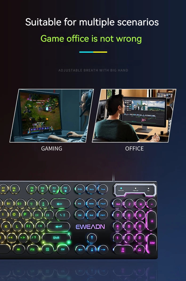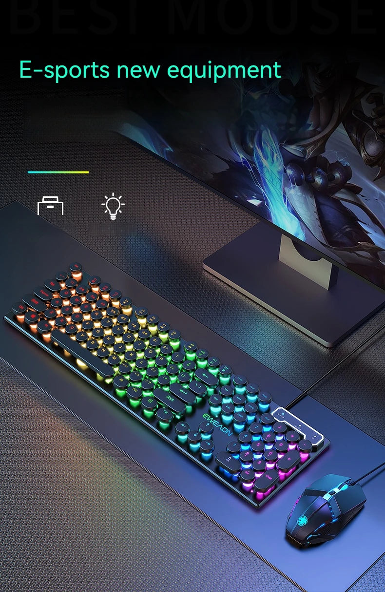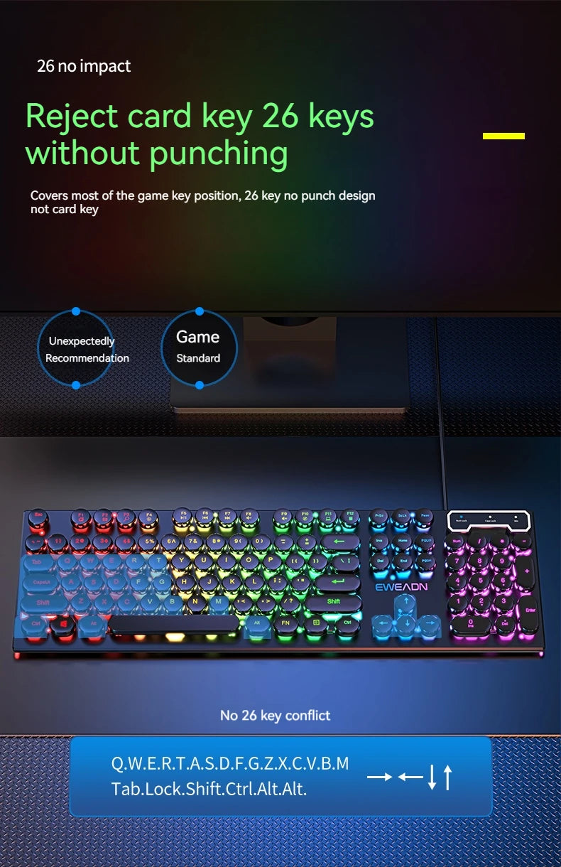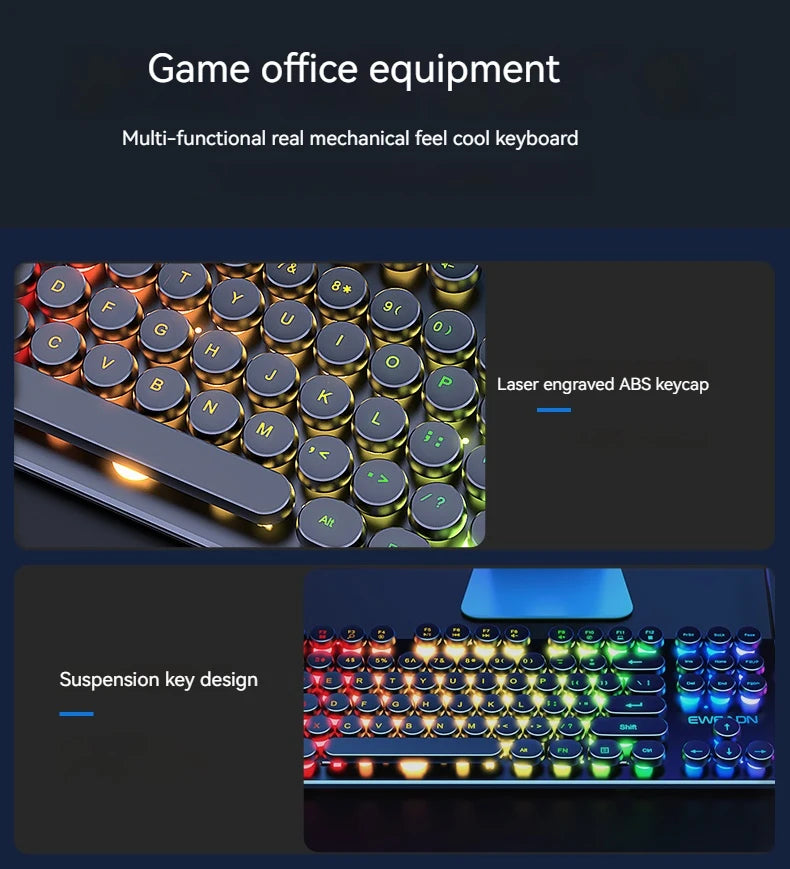 EWEADN GX330 Typewriter Gaming Keyboard, 104 Keys Wired Retro Punk Round Keycaps, with RGB Backlit, for Windows Laptop PC black