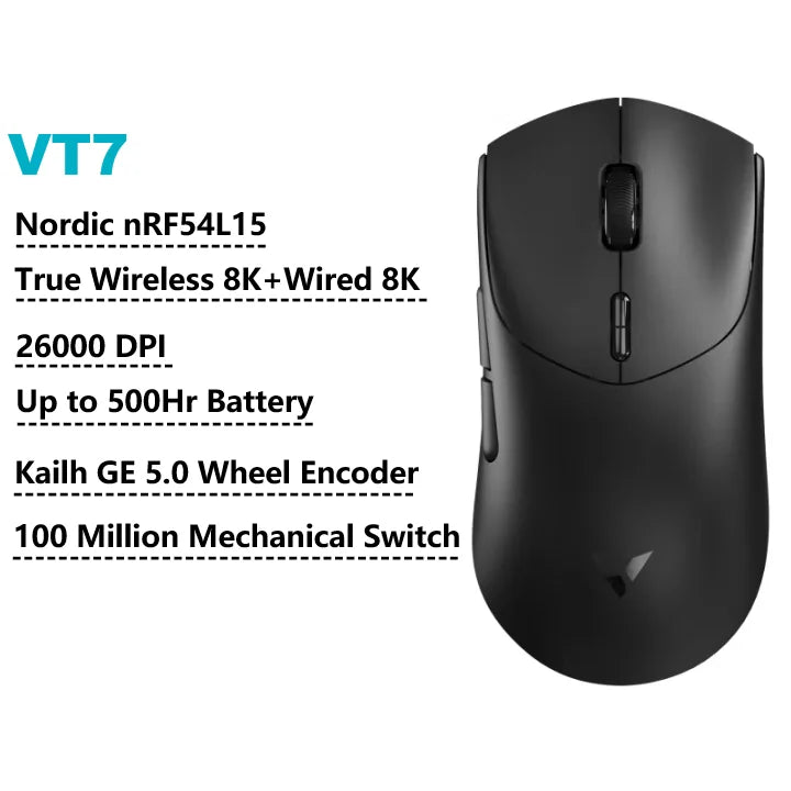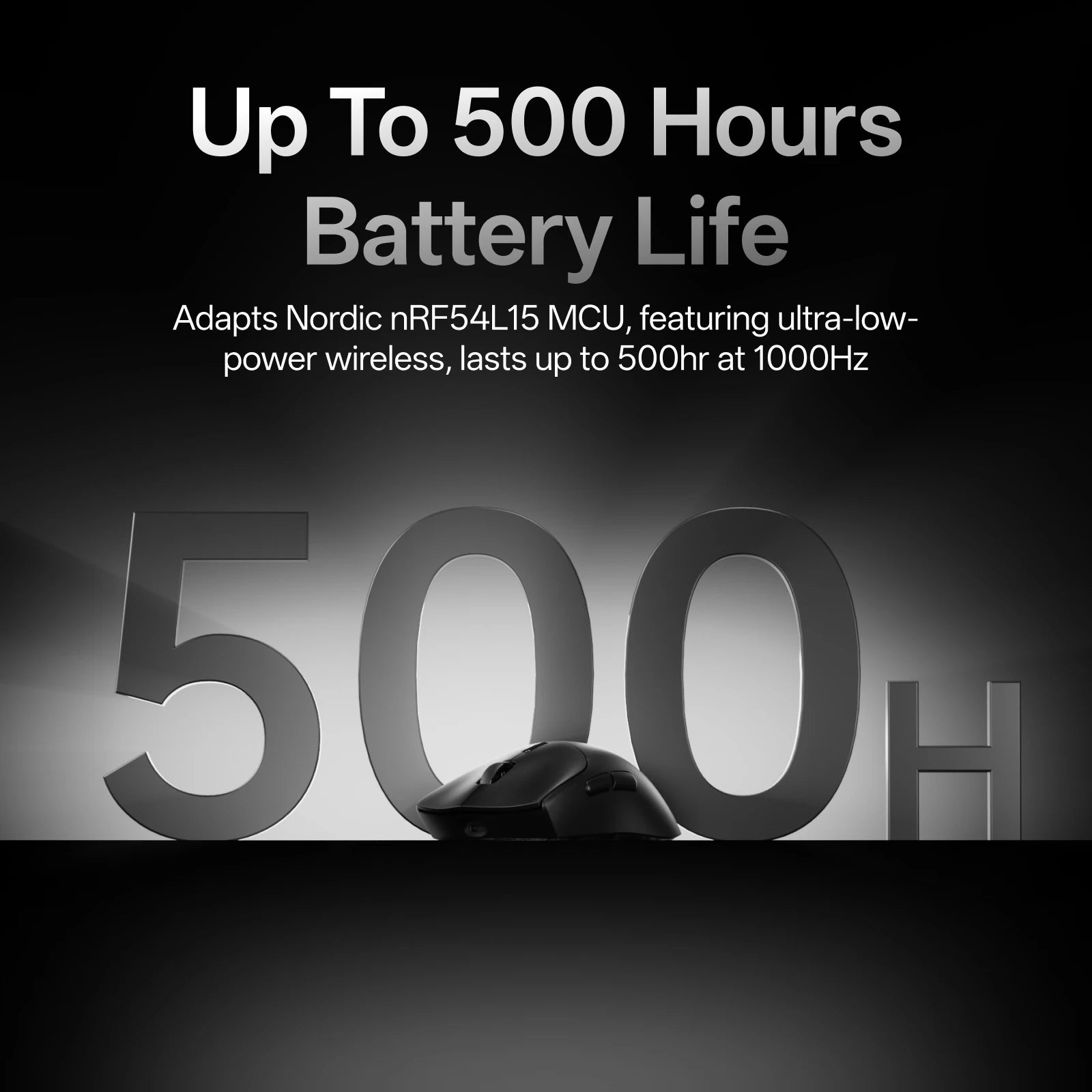 Up to 500 Hours Battery Life: Upgraded with Nordic nRF54L15 MCU that integrates an ultra-low-power wireless technology, VT7/VT7 MAX manages to make wireless gaming mouse no longer dependent on frequent charging - with an unbeatable 500 hours battery life at 1000Hz.