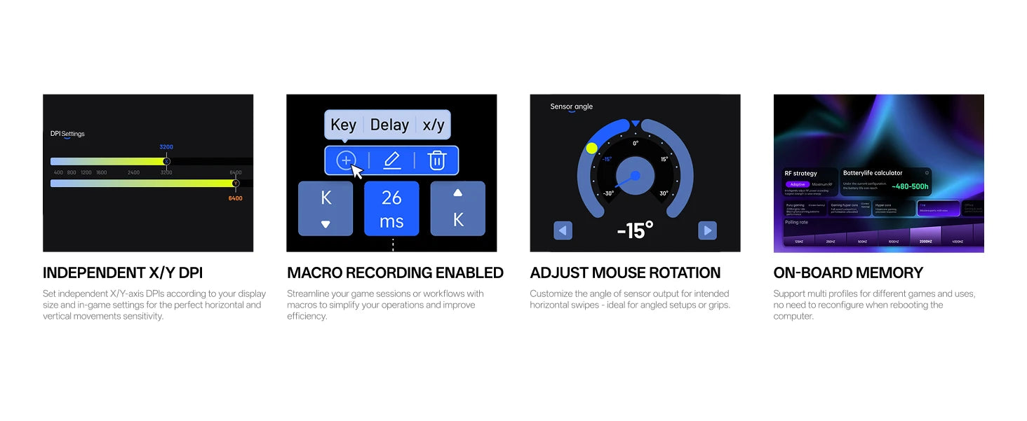 (VT7) 26K Independent X/Y DPI / (VT7 MAX) 30K Independent X/Y DPI: Enjoy responsive, pixel-precise tracking with 99.6% resolution accuracy and 26K DPI(VT7)/30K DP(VT7 MAX). Set independent X/Y-axis DPIs according to your display size and in-game settings for the perfect horizontal and vertical movements sensitivity, and switch your DPI levels on-the-fly by pressing DPI +/- buttons.